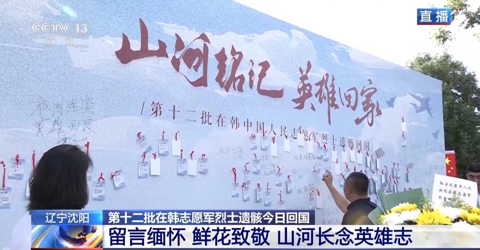此时此刻,虽然距离英雄回家还有一段时间,但是我们看到沈阳抗美援朝烈士陵园的大门前,已经聚集了很多自发赶来的社会各界群众。为了让大家可以更好地抒发内心深处对先烈们的缅怀和敬意,大家看到在我的身后,由退役军人事务部和沈阳抗美援朝烈士陵园联合发起的,以“山河铭记 英雄回家”为主题的线下活动也在今天早上正式开启。一张张小纸条,一个个或娟秀或稚嫩的方块字,都在默默地表达着对英烈的敬意。
