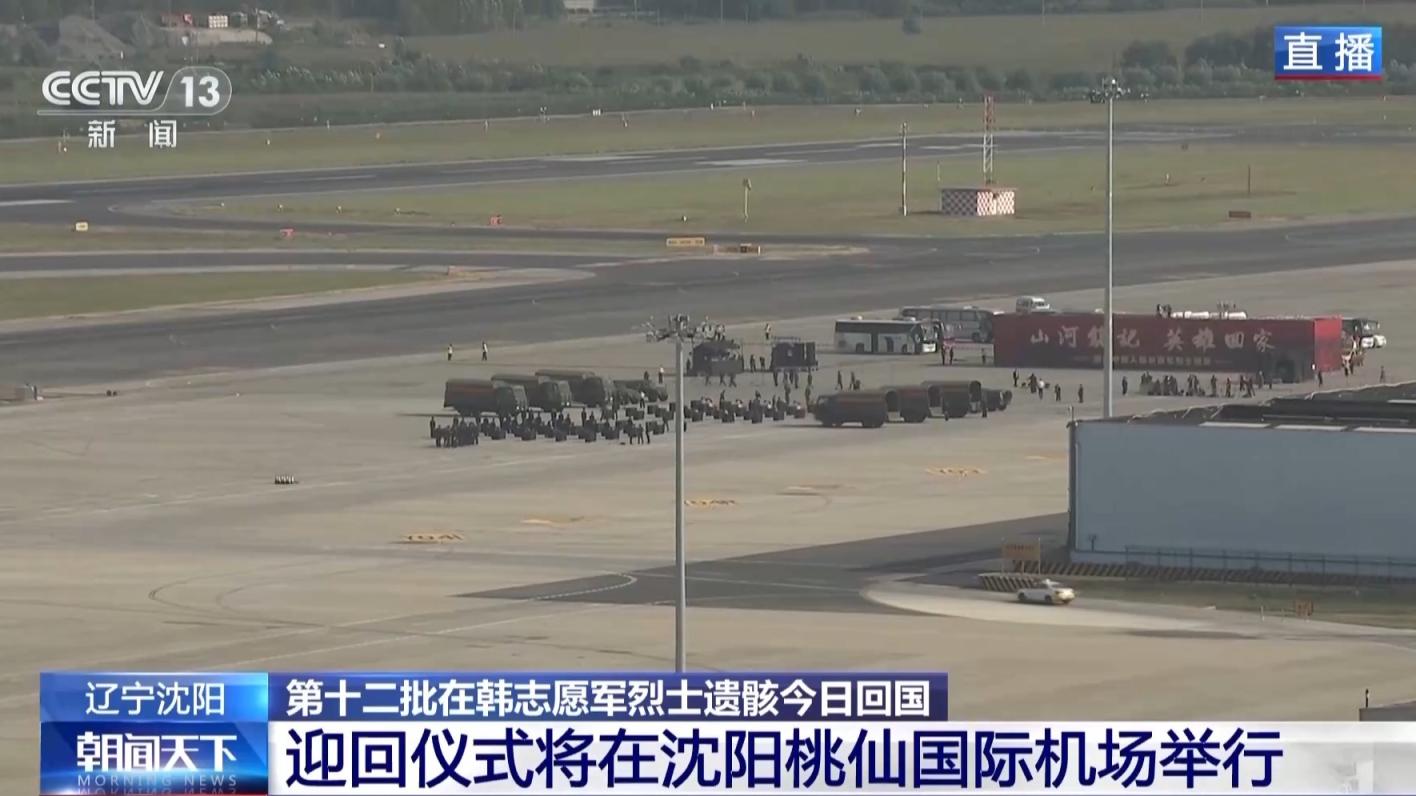 总台记者 杨海灵:沈阳桃仙国际机场的专机停机坪是举行第十二批在韩中国志愿军烈士遗骸迎回仪式的场地。稍后,搭载30位在韩志愿军烈士遗骸及其遗物的专机将在这里降落。