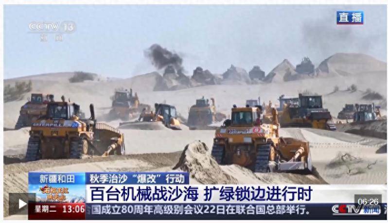 今年以来,新疆持续巩固拓展塔克拉玛干沙漠锁边成果,在原来的基础上增加“锁边”绿色防护带宽度110米至7500米,植绿扩边479万亩,把塔克拉玛干沙漠的“绿围脖”织宽织密。当下,在和田县秋季治沙会战现场,当地正组织大型机械进行沙漠平整工作,为10月份秋季植树,拓宽治沙屏障做准备。来和总台记者一起见证治沙的“硬核浪漫”!